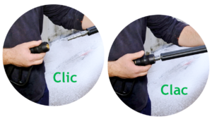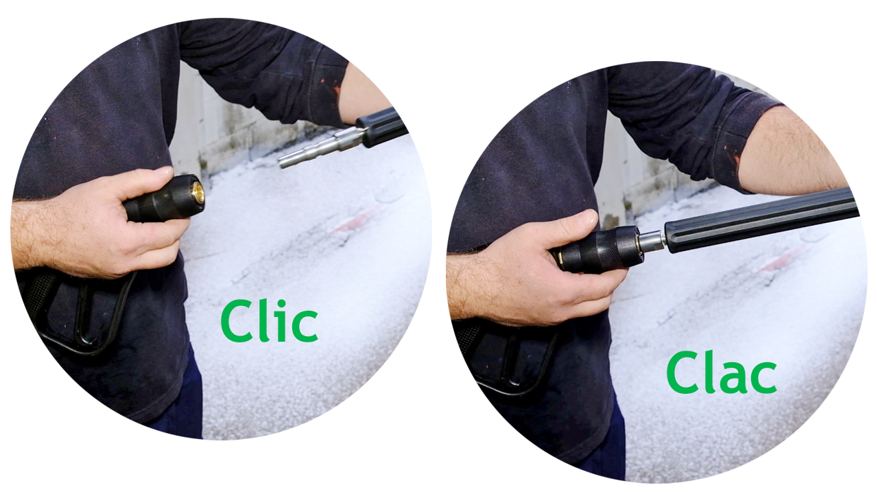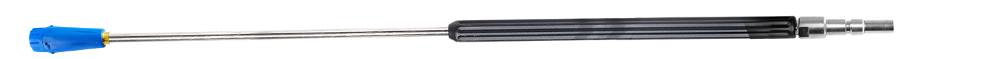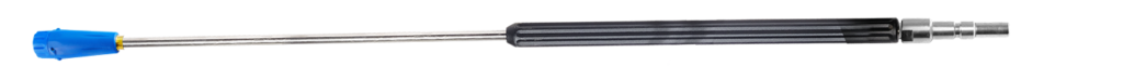 Compuesto de dos lanzas de 90 cm inox. con su cabezal azul FOAM (uno para lado derecho de la pista de lavado y otro para el lado izquierdo de la pista de lavado). Una vez la lanza está conectada a la pistola mediante el sistema “Clic – Clac”, este permite trabajar con un chorro de espuma FOAM alcanzando una distancia 3 m, dejando todo el vehículo con un manto de espuma FOAM, dejaremos reposar unos minutos y ya podremos cambiar a la lanza de aclarado con agua.
